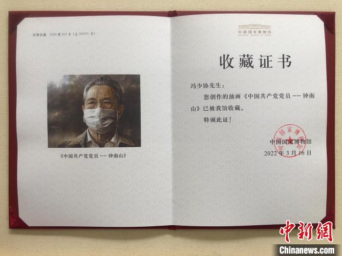 中新网广州3月20日电(记者方伟彬)一幅曾经打动无数人,以钟南山院士为主题的油画日前再次引发关注,20日,广东画院副院长冯少协向记者展示了中国国家博物馆颁发的油画《中国共产党党员——钟南山》收藏证书。